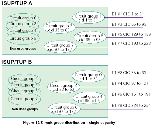 系統(tǒng)兩部分之間沒有重復(fù)的電路組("單容量"系統(tǒng),如圖12所示)的系統(tǒng)在一部分故障的情況下能夠激活另一個(gè)沒有使用的電路組,這個(gè)過程可以使用xxx_MSG_CNF_GRP消息設(shè)置電路組來實(shí)現(xiàn)。這可以為另一單元中失效的電路提供SS7信令資源以及ISUP或TUP狀態(tài)機(jī),但是,如果電路終端本身仍然同故障單元物理上相連,那么信令能夠?yàn)檫@些電路實(shí)現(xiàn)的唯一進(jìn)程是硬件阻塞。