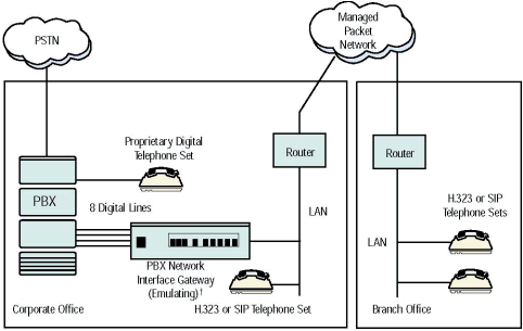 - 場(chǎng)景 2 - 把遠(yuǎn)端辦公室通過一個(gè)包交換網(wǎng)絡(luò)連接到總公司PBX系統(tǒng)上. 基本來說, 網(wǎng)關(guān)把數(shù)字電話功能擴(kuò)展到遠(yuǎn)程辦公室.